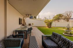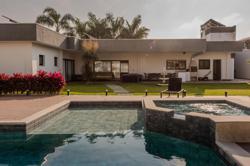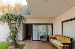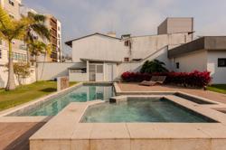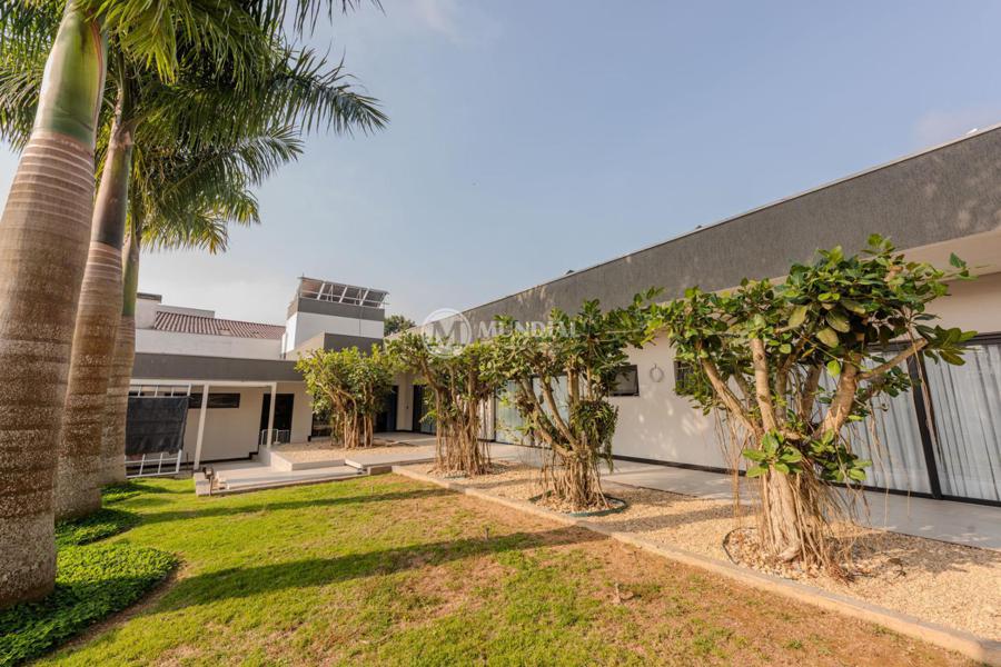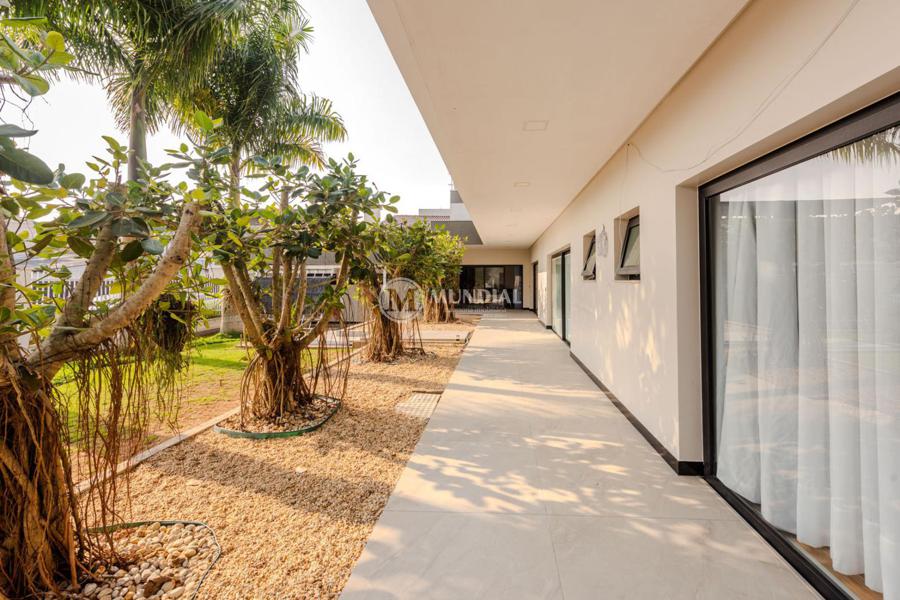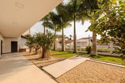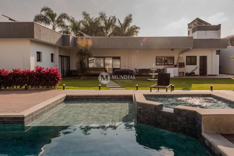 A propriedade abrange quatro terrenos, proporcionando uma ampla área de lazer e jardins exuberantes. A casa possui uma metragem generosa, com amplos ambientes internos, luminosos e arejados, com grandes portas oferecendo uma vista deslumbrante do jardim e da piscina e uma excelente distribuição dos espaços.