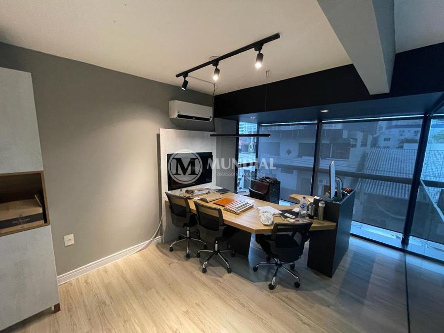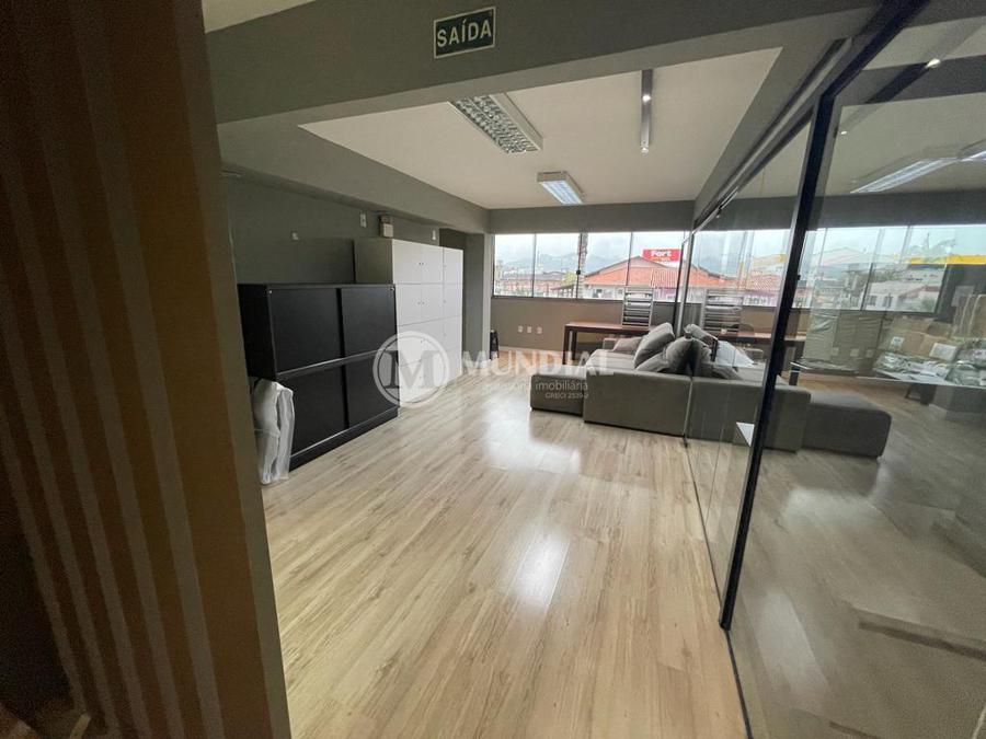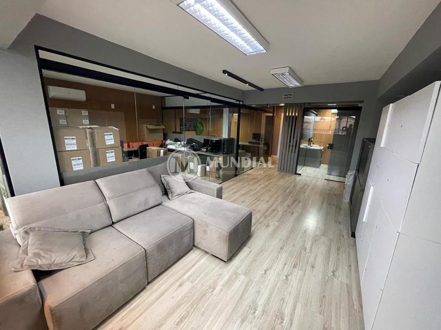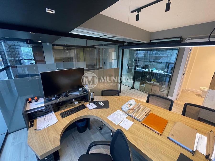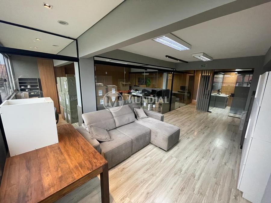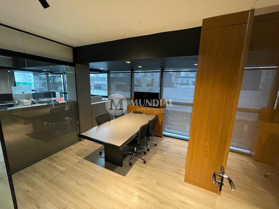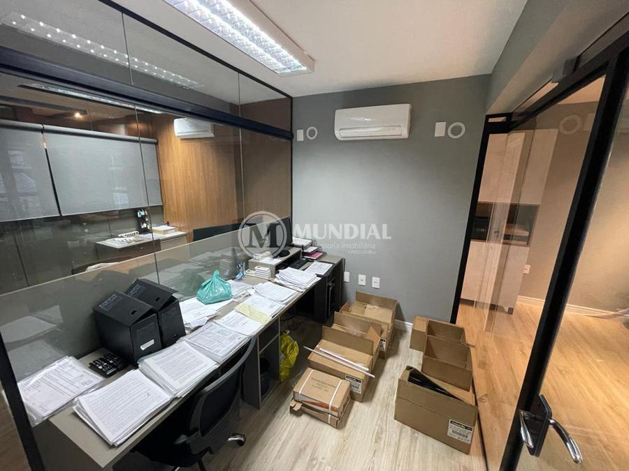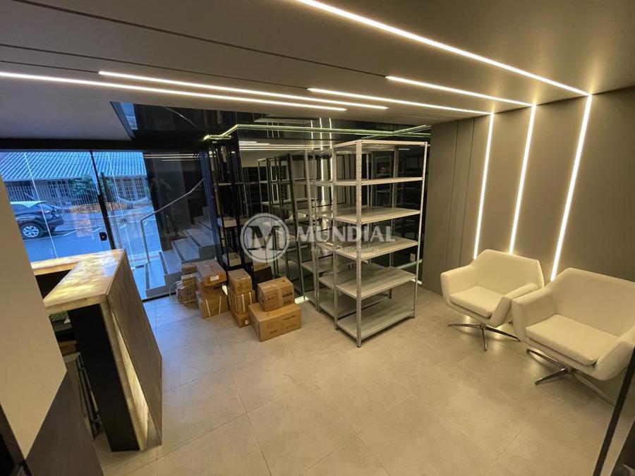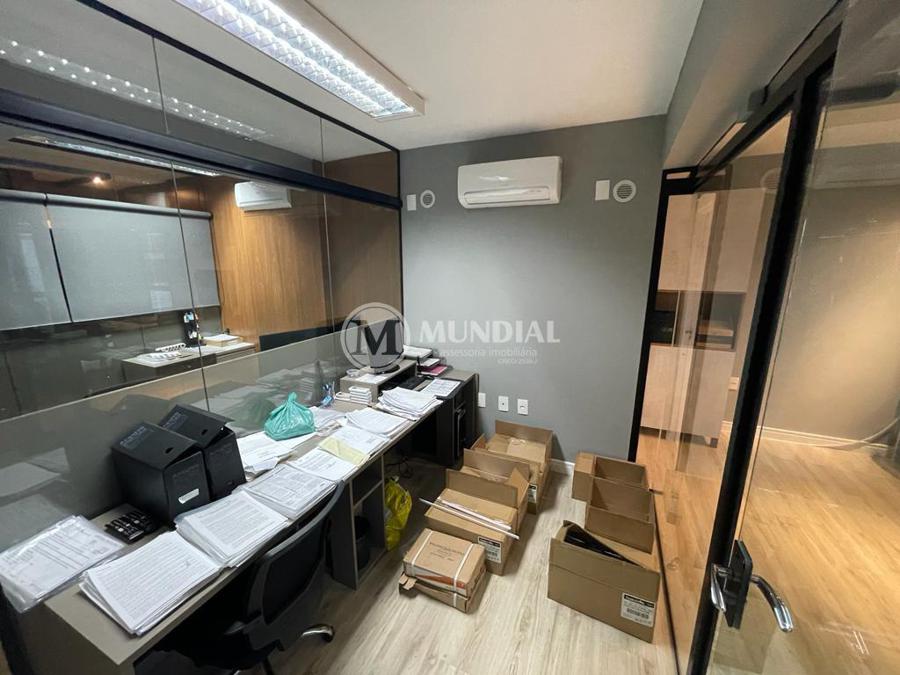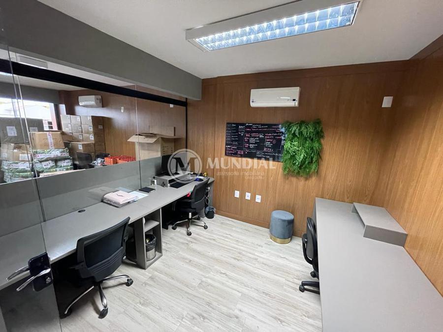 Escritório ? com acesso pela escada comercial e pela escada central (isolada), hoje com divisórias de vidro temperado, vidro refletivo na parte frontal e janelas laterais (muita luz natural), persianas solares, piso laminado e ar condicionado em todas as salas. Na atual configuração temos uma sala de reunião para até 07 pessoas, sala comercial para 05 pessoas, sala diretoria com banheiro privativo, sala secretária para 02 pessoas, sala financeiro para até 03 pessoas com sala de armários, sala fundos para até 05 pessoas, sala lateral para até 11 pessoas, espaço aberto para até 02 salas e 09 pessoas. Total de salas atuais 07 unidades. As divisórias em vidros foram feitas para receber alterações, são coladas na parte inferior com vidros de largura múltipla e com bandeira das vigas até o teto, podendo serem facilmente remanejadas sem perdas. Copa, banheiro masculino e feminino.