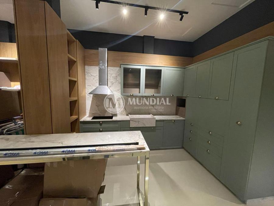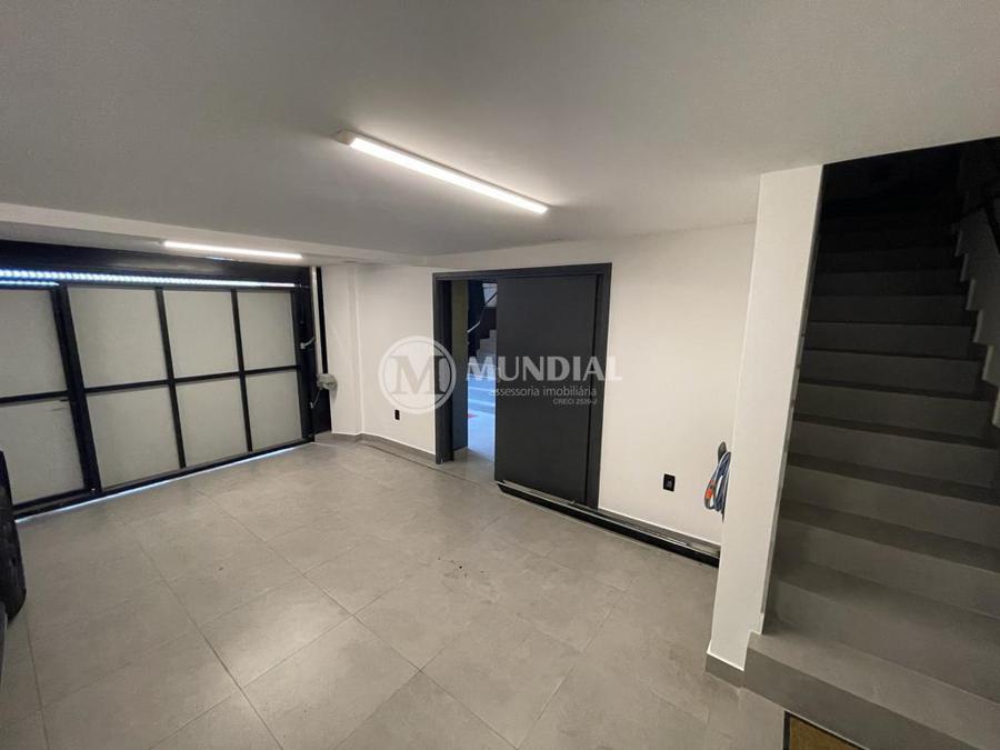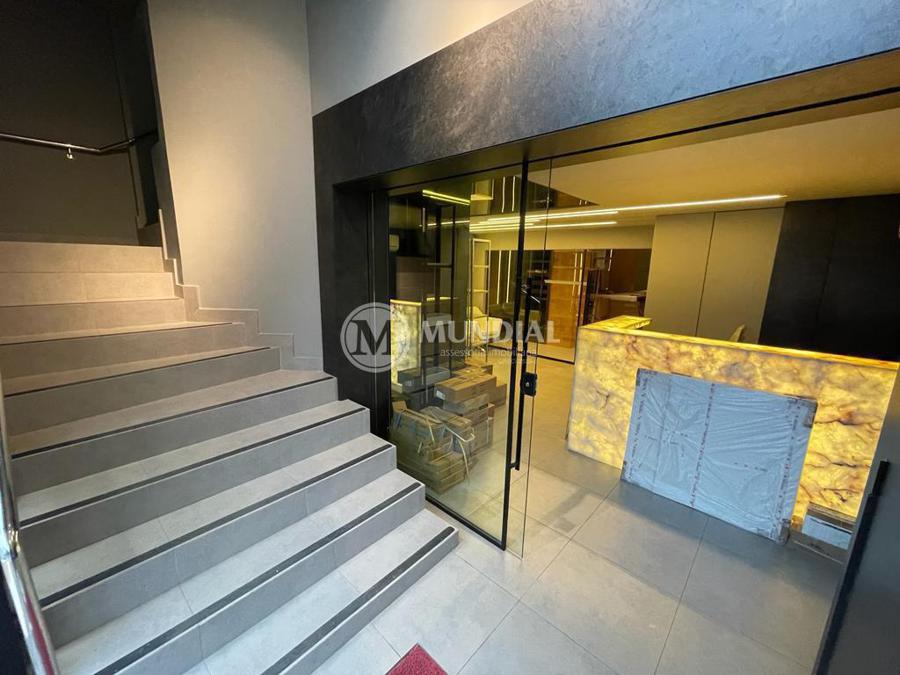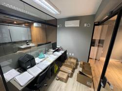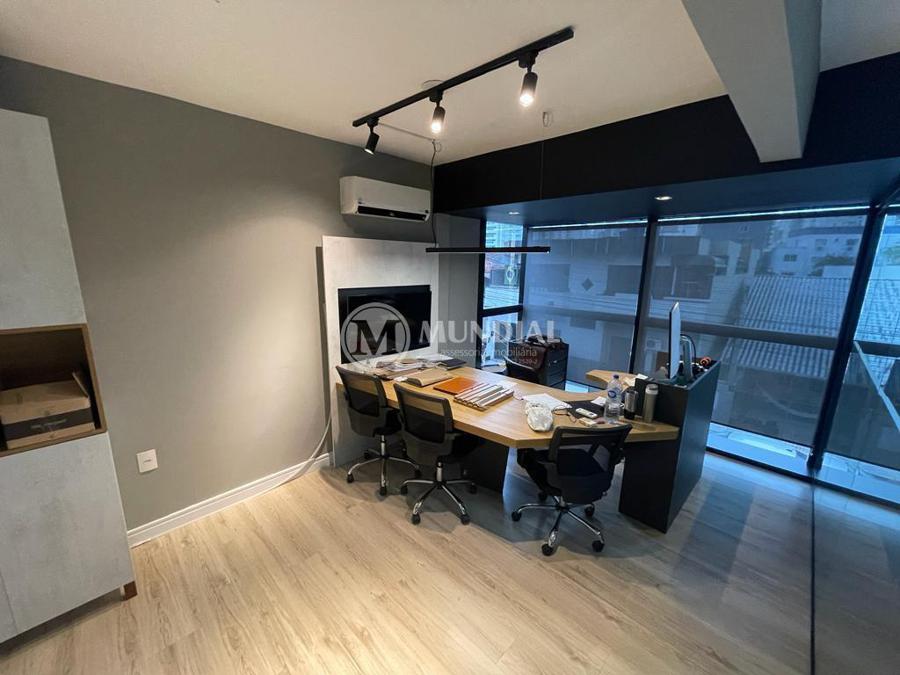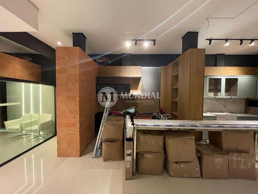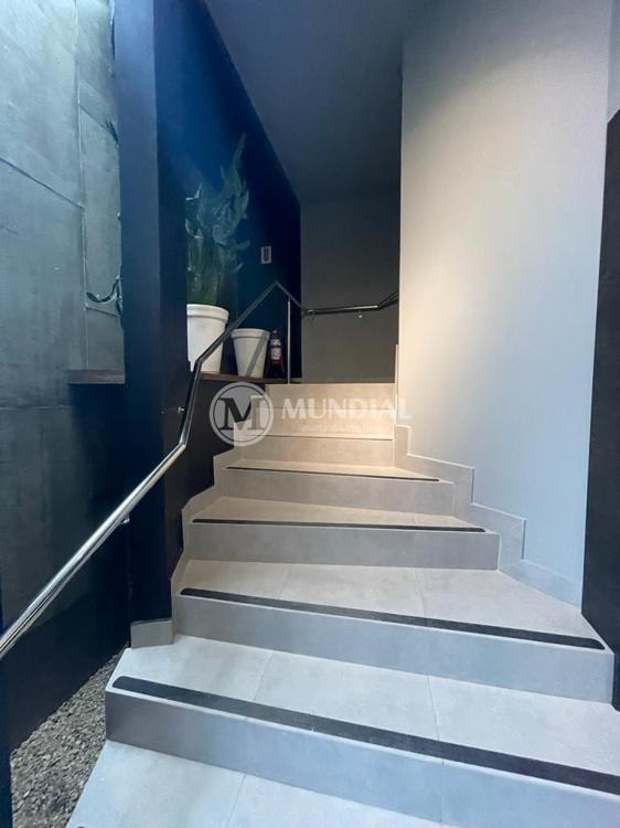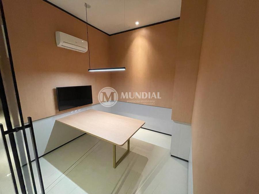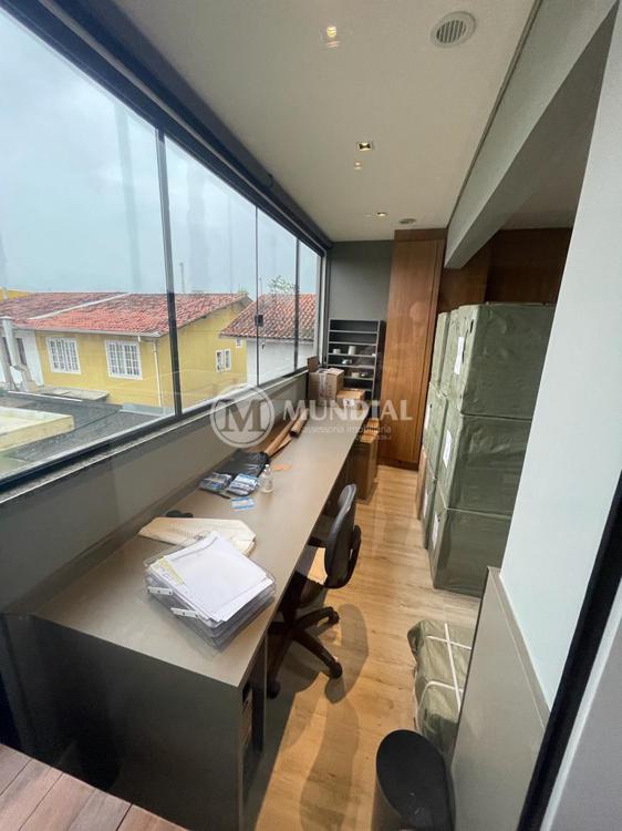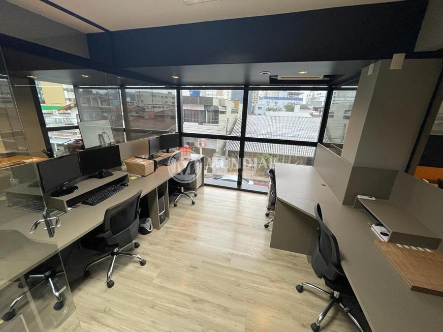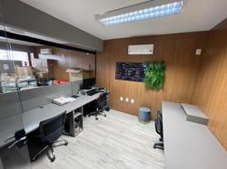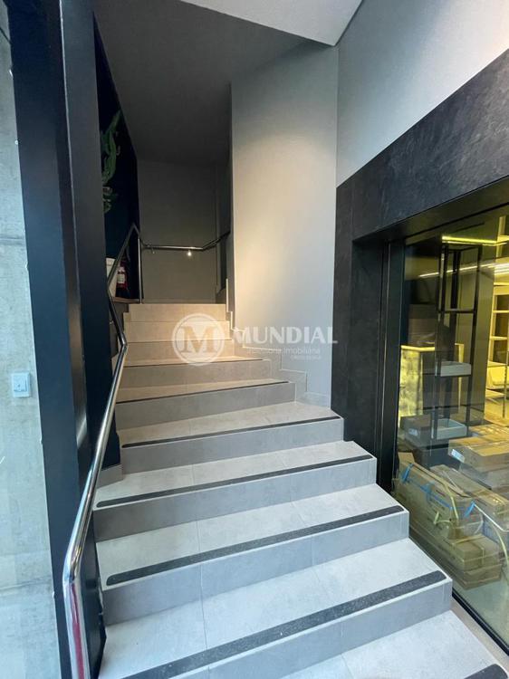 Escritório ? com acesso pela escada comercial e pela escada central (isolada), hoje com divisórias de vidro temperado, vidro refletivo na parte frontal e janelas laterais (muita luz natural), persianas solares, piso laminado e ar condicionado em todas as salas. Na atual configuração temos uma sala de reunião para até 07 pessoas, sala comercial para 05 pessoas, sala diretoria com banheiro privativo, sala secretária para 02 pessoas, sala financeiro para até 03 pessoas com sala de armários, sala fundos para até 05 pessoas, sala lateral para até 11 pessoas, espaço aberto para até 02 salas e 09 pessoas. Total de salas atuais 07 unidades. As divisórias em vidros foram feitas para receber alterações, são coladas na parte inferior com vidros de largura múltipla e com bandeira das vigas até o teto, podendo serem facilmente remanejadas sem perdas. Copa, banheiro masculino e feminino.