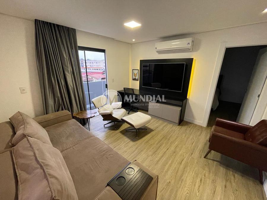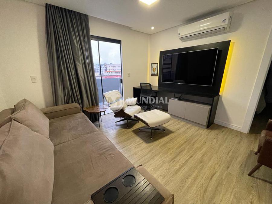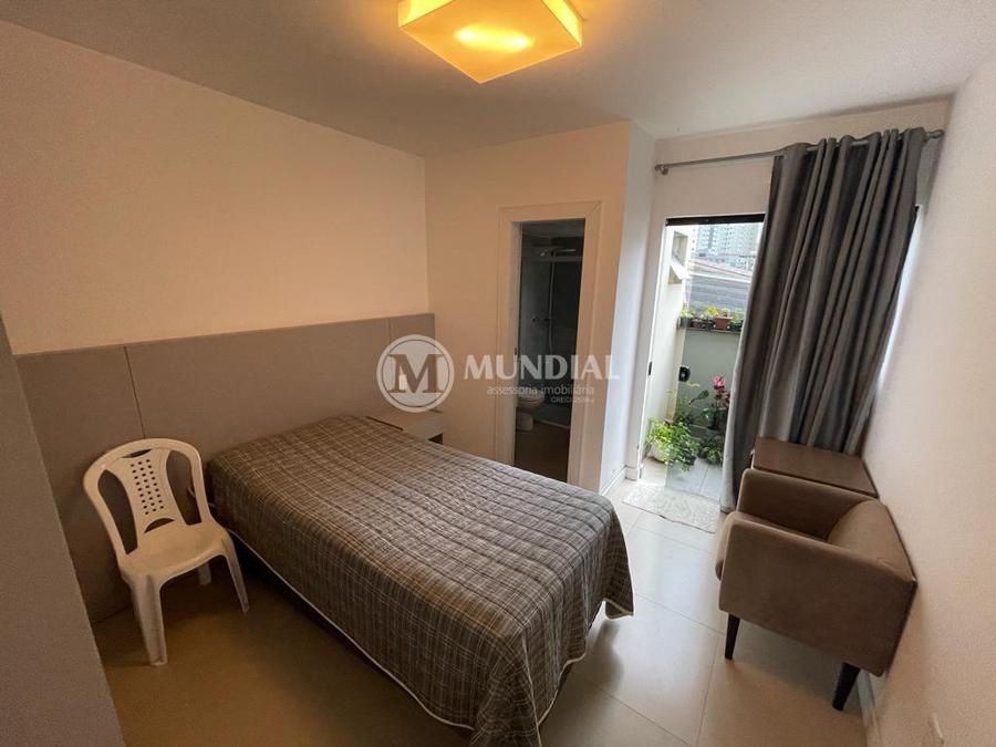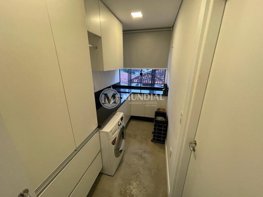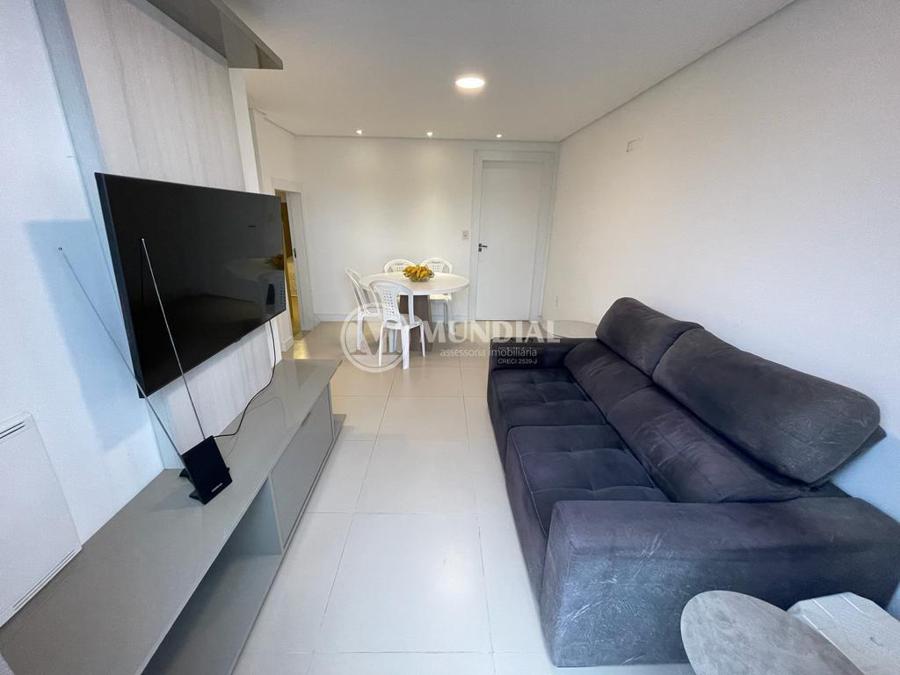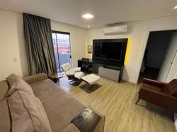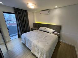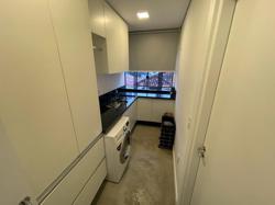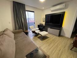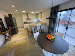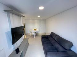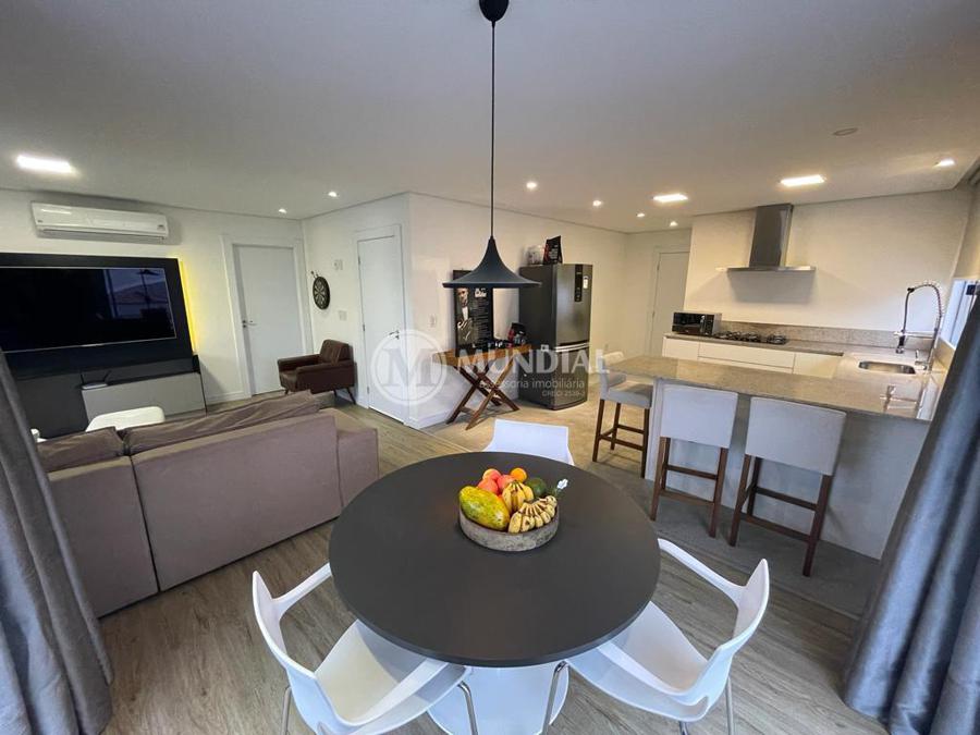 Apartamento ? com 70 m², ampla sacada, suíte, living, banheiro social e lavanderia, piso vinílico e ar condicionado. Permite churrasqueira a carvão privativa.