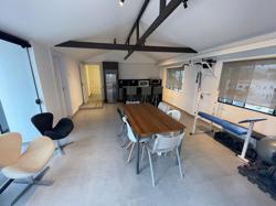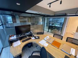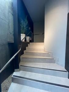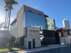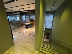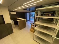 Hall e Recepção, com escada separada para acesso do escritório (com luz natural). Recepção com lavabo, ar condicionado, copa embutida e ambiente para material de limpeza. Acesso da garagem pela recepção (com porta). A recepção tem porta de vidro para o salão e para o hall de entrada, podendo controlar o acesso.