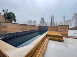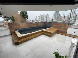 Piscina - Área Aberta ? ampla vista, ensolarado, piscina com deck (motores ocultos), led e higienização da água por sal, sala envidraçada (próximo a escada dos fundos) com pontos de água e energia (pode ser utilizado para lavanderia ou churrasqueira), ducha externa, encanamento para aquecimento e cascata.